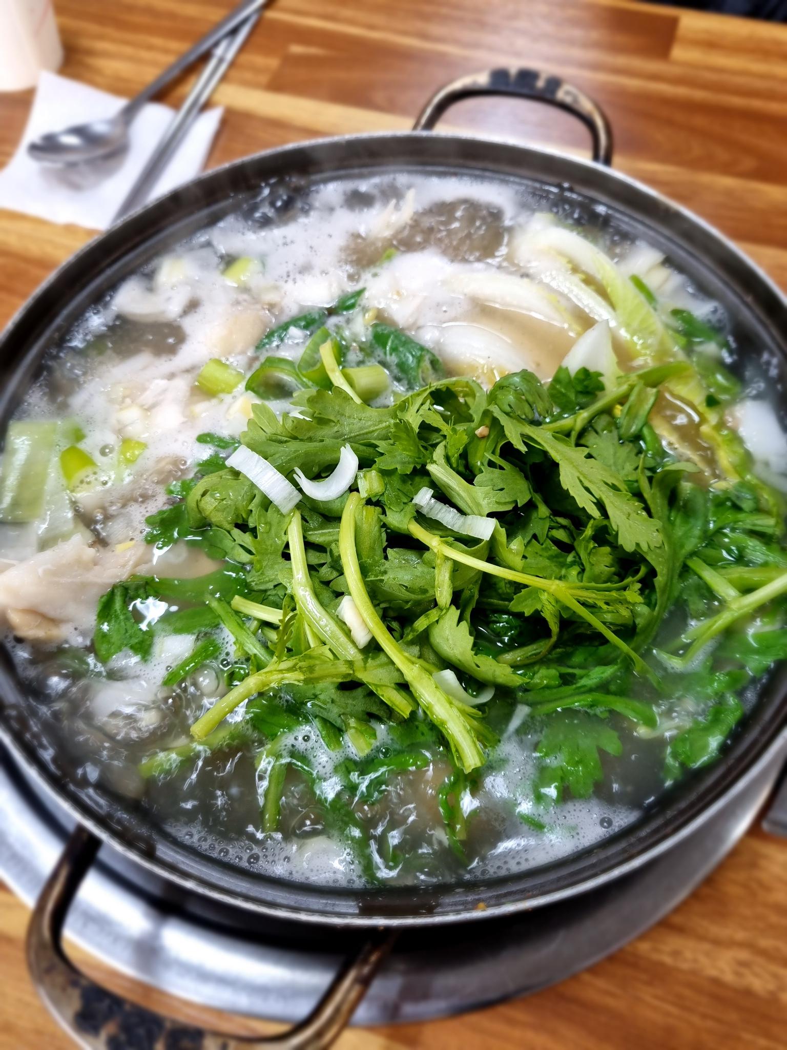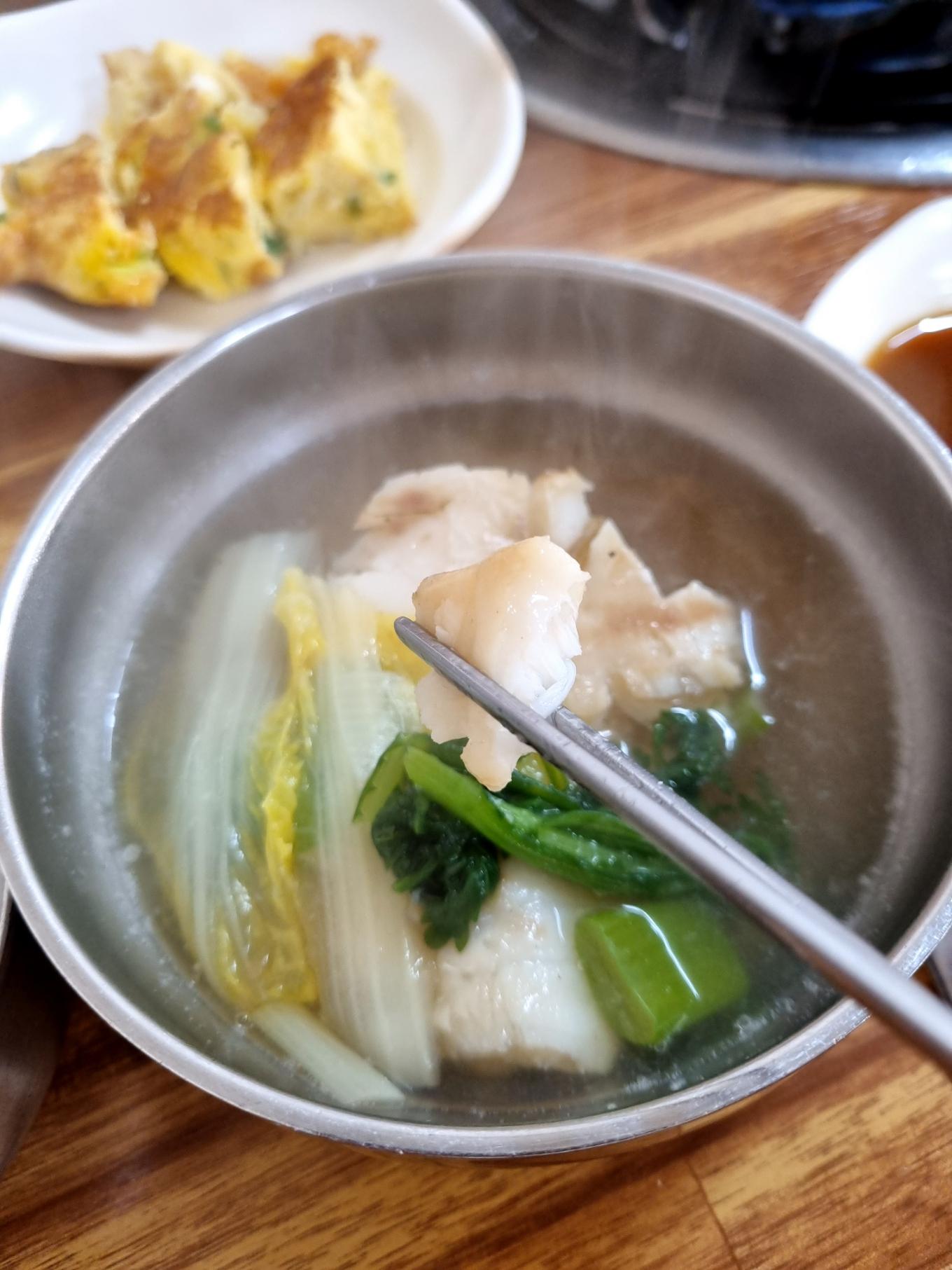 맑은 지리에 야채와 뽈데기를 넣어서 끓인 깔끔한 국물의 뽈데기탕