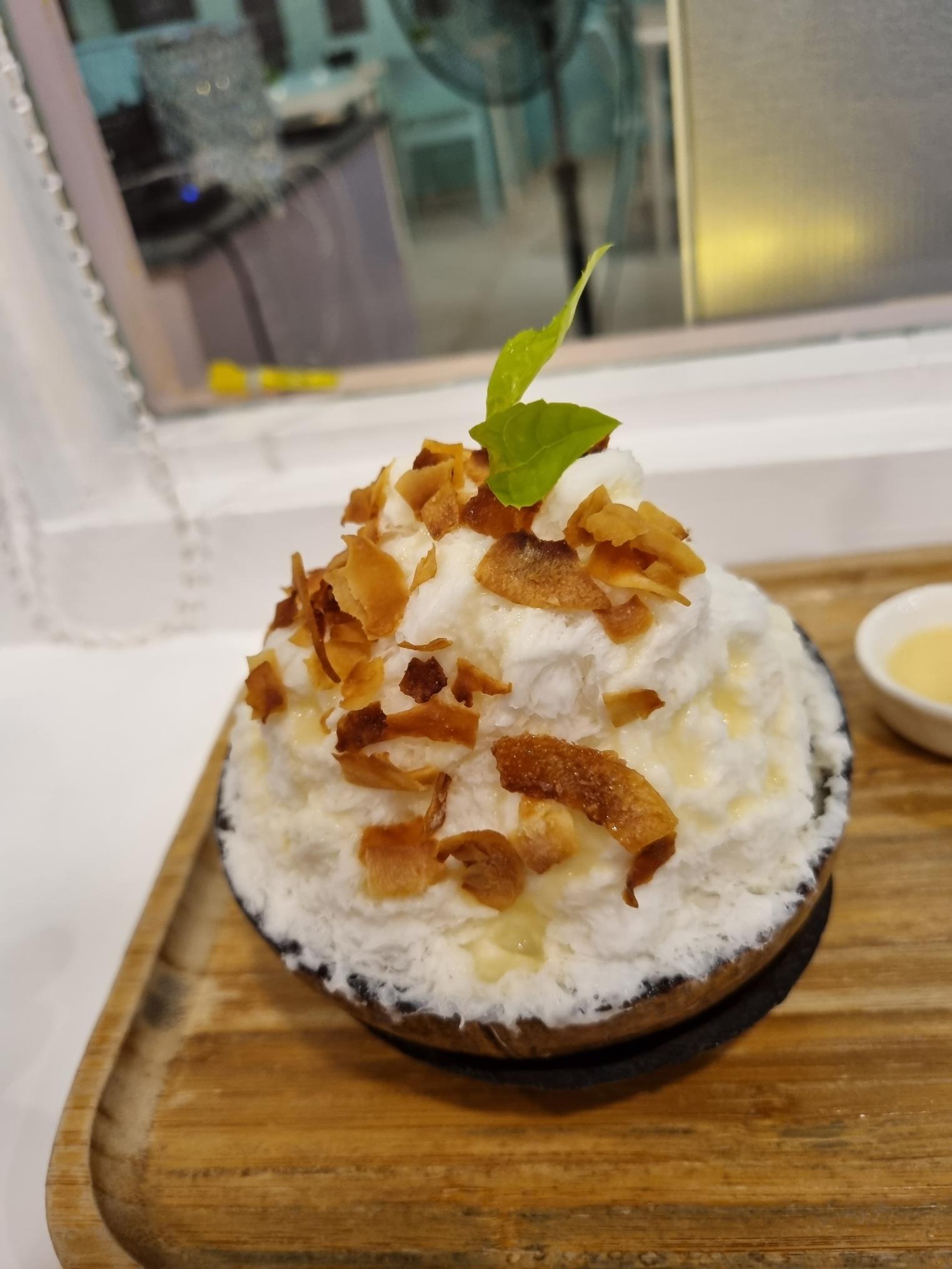 코코넛아이스크림 위에 올라간 코코넛칩. 아이스크림과 같이 먹으면 너무 맛있어~
