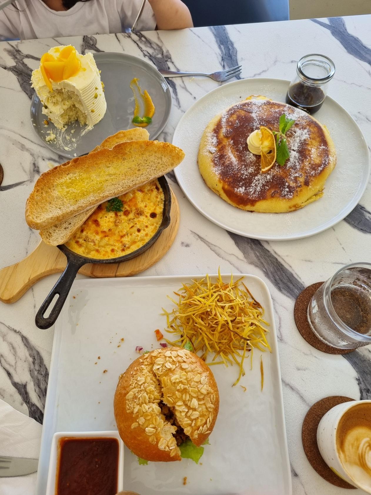 팬케익, 맥앤치즈, 햄버거를 주문했는데, 체리는 망고케익을 드시겠다고 한다.